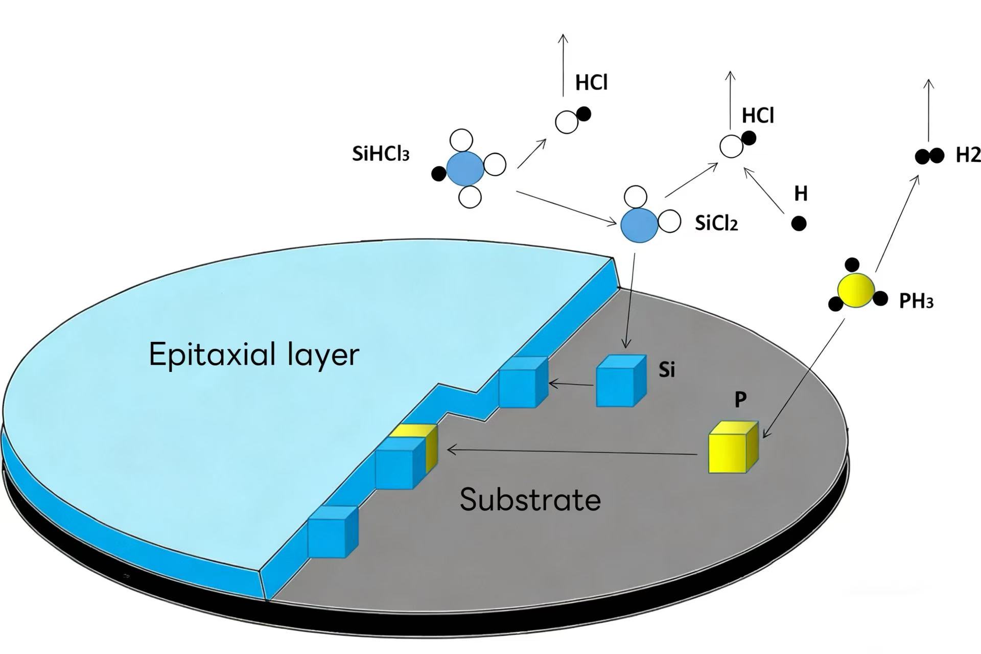 실리콘 에피택시는 일반적으로 기상 에피택시로를 사용합니다. 그 원리는 실리콘 소스(실란, 디클로로실란, 삼염화실란, 사염화규소 등)가 분해되어 수소와 반응하여 실리콘을 생성하는 것입니다. 성장 중에 PH₃, B₂H₆ 등의 도핑 가스가 동시에 유입될 수 있습니다. 가스 분압에 의해 도핑 농도가 정밀하게 제어되어 특정 저항률을 갖는 에피택시층을 형성합니다.