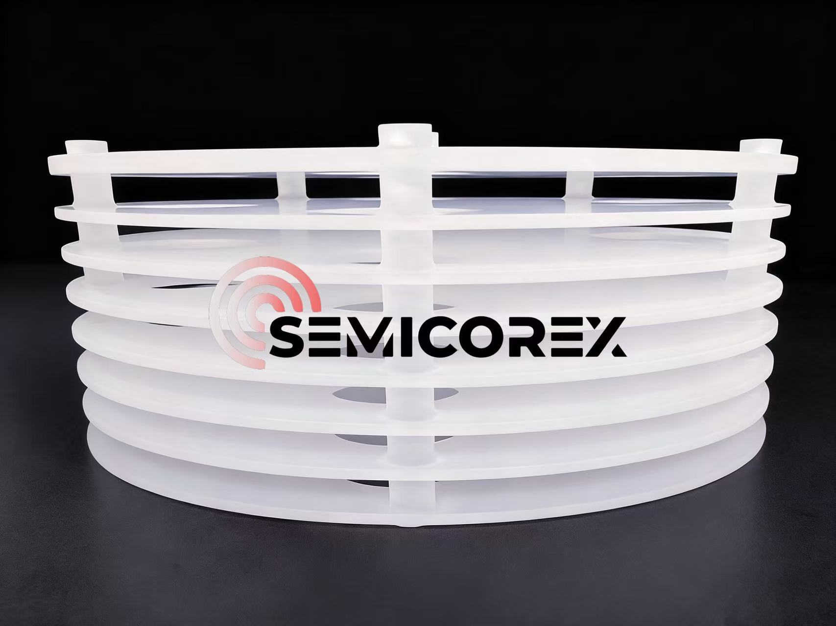 4. Kritisk dimension주로 쉘, 베이스, 지지 컬럼, 단열판 등의 핵심 구성요소로 구성됩니다. 지지 컬럼과 위치 지정 범프의 정밀한 설계 덕분에 석영 보온병 용기는 실리콘 웨이퍼 캐리어를 단단히 고정하여 안정적인 지지력을 제공함으로써 고온 반도체 제조 공정 중 변위를 방지합니다. 한편, 다층 절연 구조는 열 손실을 효과적으로 최소화하고, 일관된 퍼니스 온도를 유지하여 공정 전반에 걸쳐 실리콘 웨이퍼의 균일한 필름 두께를 보장합니다. 반도체 제조 공정의 정확성과 제품 품질을 보장하는 중요한 요소는 세미코렉스의 석영 보온병입니다.