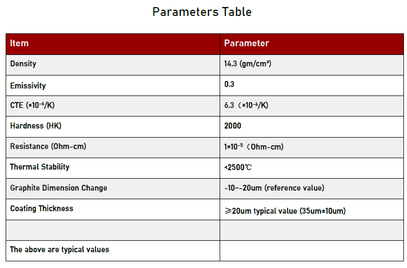 탄탈륨 카바이드는 매우 높은 융점(약 3880℃), 우수한 열 전도성, 우수한 화학적 안정성, 뛰어난 기계적 강도를 지닌 고성능 소재입니다. 구체적인 성능 매개변수는 다음과 같습니다.